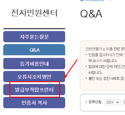 2λ²μ λ°©λ²μΌλ‘ 'μ μλ―ΌμμΌν°' νμ΄μ§λ‘ μ΄λνκ² λ©λλ€. μ¬κΈ°μλ μΌμͺ½ μ¬μ΄λλ°μ λͺκ°μ§μ λ©λ΄κ° μλλ°μ. 'μ주묻λμ§λ¬Έ, Q&A, λ±κΈ°λΉμ©μλ΄, μ€λ₯μμ‘°μΉλ°©μ, λ°κΈλΆμ ν©νλ¦°ν°, μΈμ¦μ 볡μ¬'μ κΈ°λ₯μ΄ μ€λΉλμ΄ μμ΅λλ€. μ°λ¦¬μ λͺ©μ μ νλ¦°ν°λ₯Ό μ°Ύλ κ²μ΄μ£ . 'λ°κΈλΆμ ν©νλ¦°ν°' λ©λ΄λ₯Ό μ νν©λλ€.