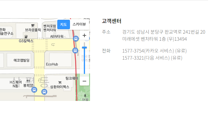 ์ด๋๋ ํ์ด์ง์ '๊ณ ๊ฐ์ผํฐ'์ ๋ํ ์ ๋ณด๋ฅผ ๋ณด์ฌ์ฃผ๋ ์ฌ์ง์ ์ผ๋ถ์ ๋๋ค. ํด๋น ์ ๋ณด์ ์ํ๋ฉด '์ ํ'๋ผ๊ณ ๋์ด ์๋ ๋ถ๋ถ์ ๋ฒํธ๊ฐ ์๋ด๋์ด ์๋ค๋ ๊ฒ์ ์ ์ ์์ต๋๋ค. ์ ํ๋ฒํธ๋ ์นด์นด์ค์ ๊ฒฝ์ฐ '1577-3754'์ด๋ฉฐ, ๋ค์์ ๊ฒฝ์ฐ ''1577-3321"๋ก ๋์ด ์์ต๋๋ค. ์ฌ์ฉํ ์ ์์๊น์.